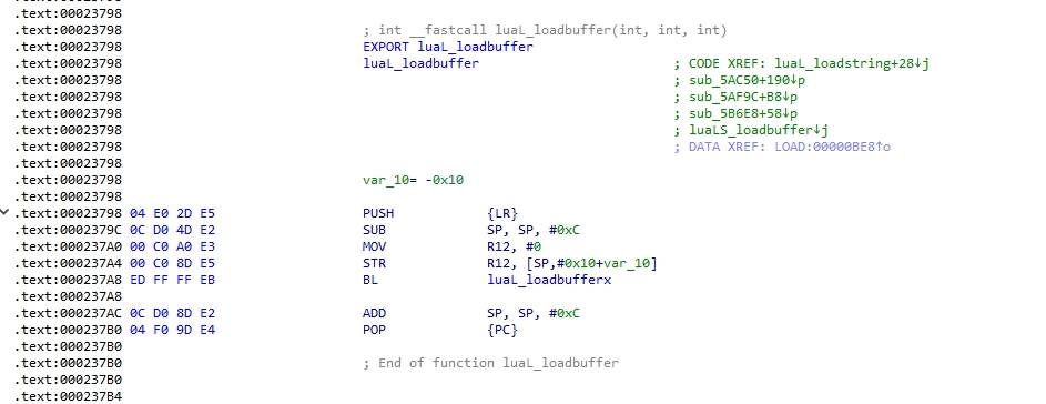 arm 指令中 BL 代表 无条件跳转, 后面的符号是 luaL_loadbufferx ,理解起来就是 跳转到 lual_loadbufferx 符号所在的偏移执行